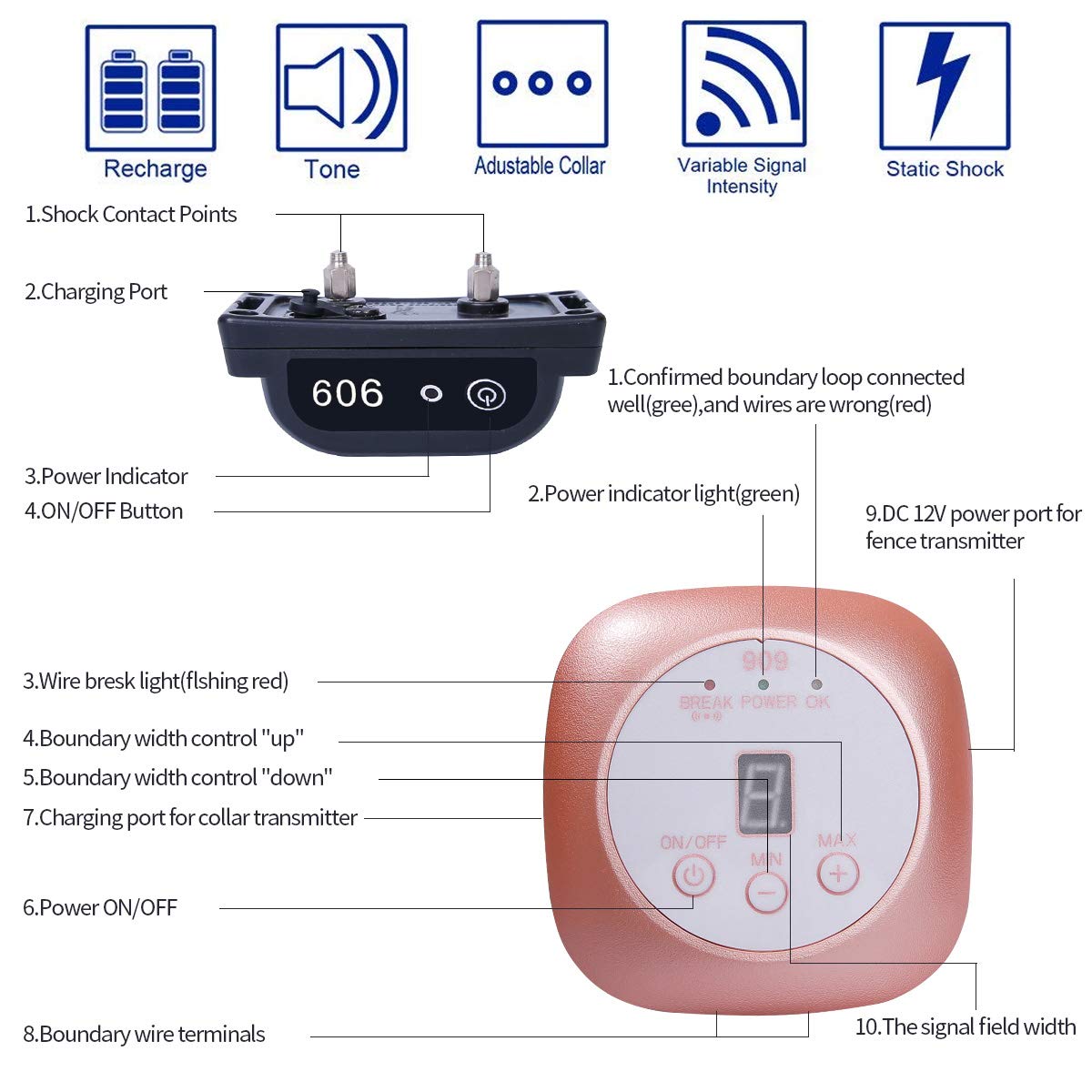 - SAFE & EASY TO PROTECT YOUR DOGS -- Our dog fence containment system is ideal for off-leash training and training your dog to stay in the yard, stop barking, and stop digging under or jumping over your fence. The rechargeable, rainproof dog collar will beep/shock once as the dog approaches boundary wire and receive a static correction.